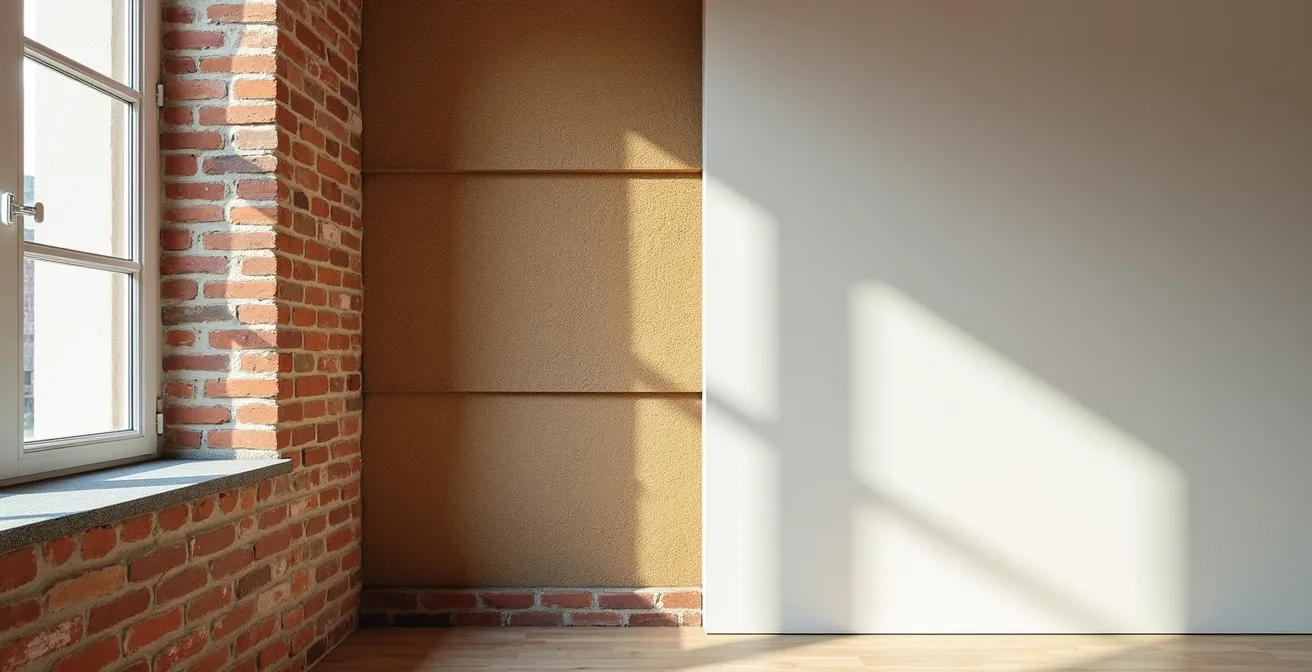 Hier hebben de dampopen, bio-ecologische materialen zoals houtvezel of cellulose een significant voordeel. Door hun hogere densiteit en vezelige, onregelmatige structuur absorberen ze geluidsgolven veel beter dan lichte, stijve kunststofschuimen zoals PIR. Een correct uitgevoerde voorzetwand, opgevuld met een materiaal als houtvezel en afgewerkt met een dubbele laag gipsplaat, kan volgens experts 10-15 dB extra reductie van het luchtgeluid opleveren. Aangezien de decibelschaal logaritmisch is, komt een reductie van 10 dB overeen met een halvering van het waargenomen geluidsniveau.
